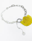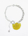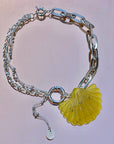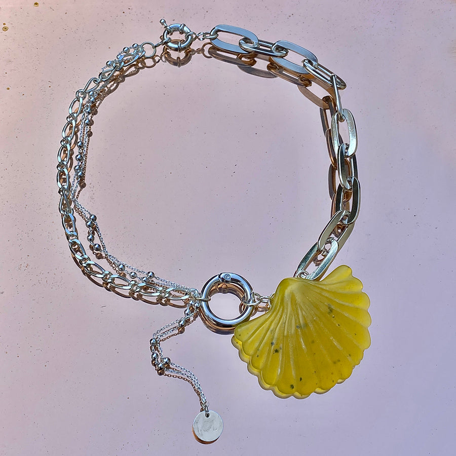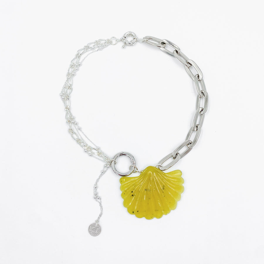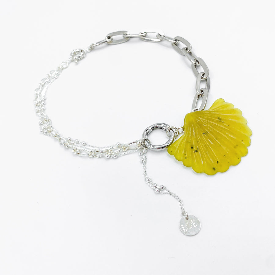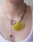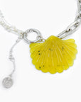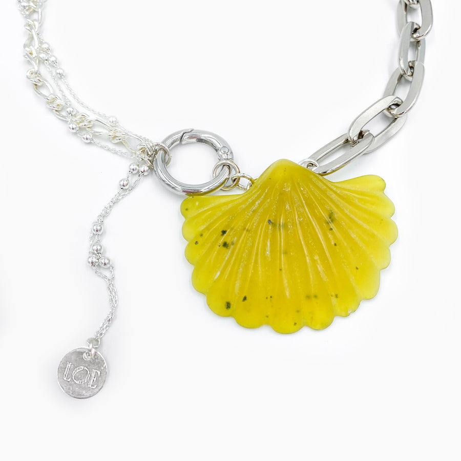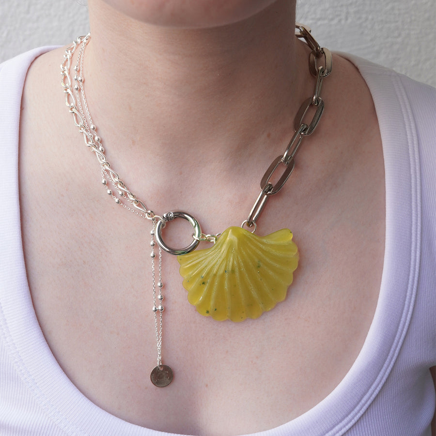 Ce collier argenté se distingue par un pendentif, en pierre semi précieuse de couleur jaune / kaki, taillé en forme de coquillage, suspendue entre des chaînes reliées par un mousqueton. Un bijou à la fois audacieux et raffiné.