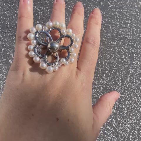 Cette bague en forme de fleur, en argent 925, est enroulée de perles d’eau douce en nacre de couleurs crèmes / blanches. Une pièce singulière, à la fois précieuse et intemporelle pour habiller votre main.