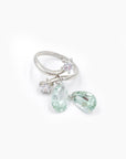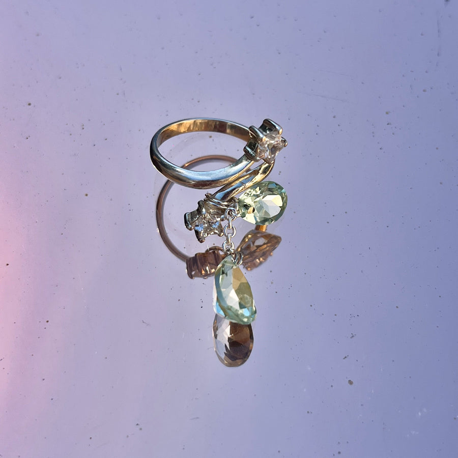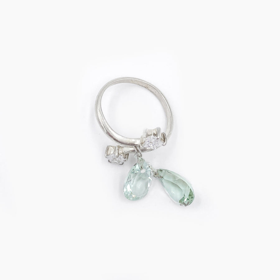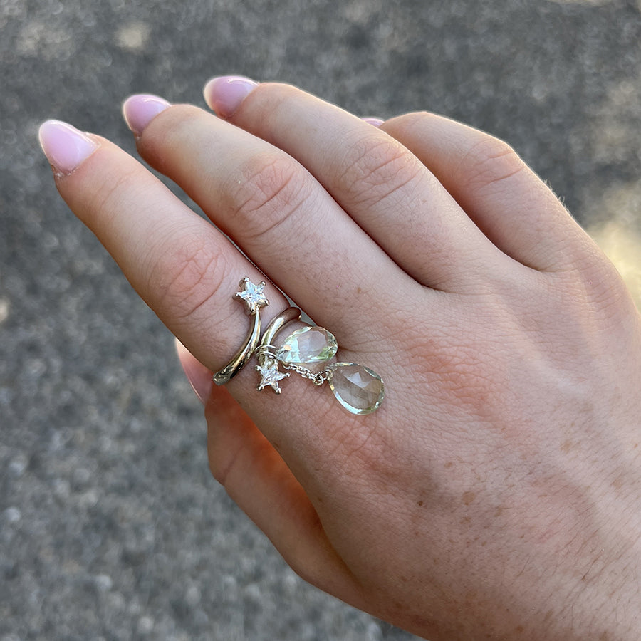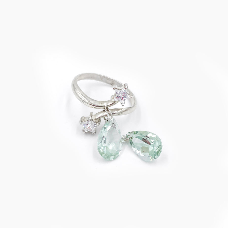 Cette bague en argent 925 entrelace deux étoiles serties de strass dans un design délicat. Deux gouttes facettées en améthyste verte, pierre semi-précieuse naturelle, tombent en cascade sur la main pour un effet précieux et lumineux.