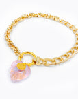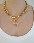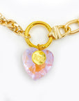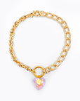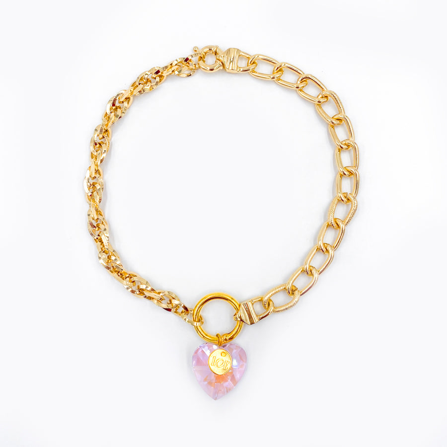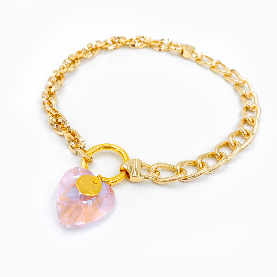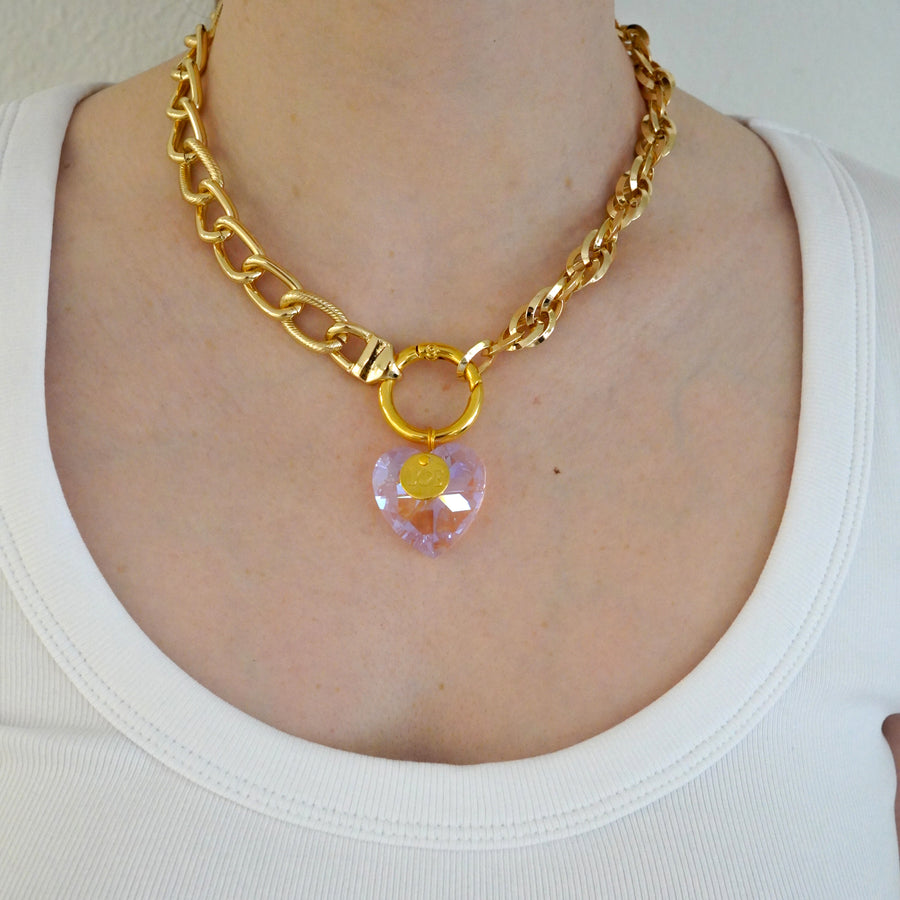 Ce collier se compose de deux chaînes en laiton or, sublimées par un pendentif cœur en cristal Swarovski rose, aux reflets brillants.