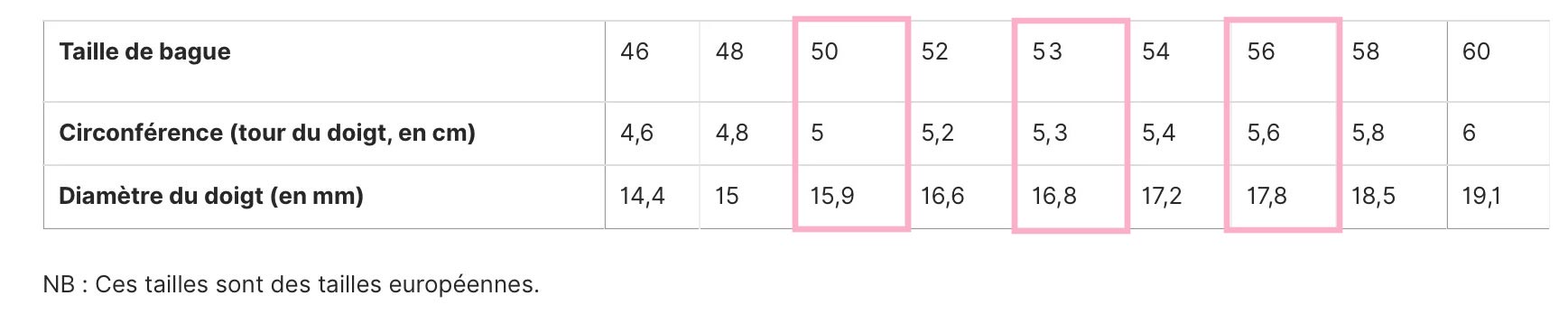 - Pour un cadeau, si vous ne parvenez pas à vous munir d’une bague, vous pouvez vous référer aux tailles de bague standard, c’est-à-dire 53 pour les femmes.