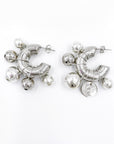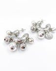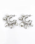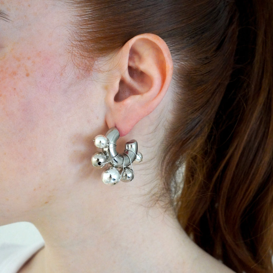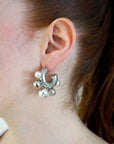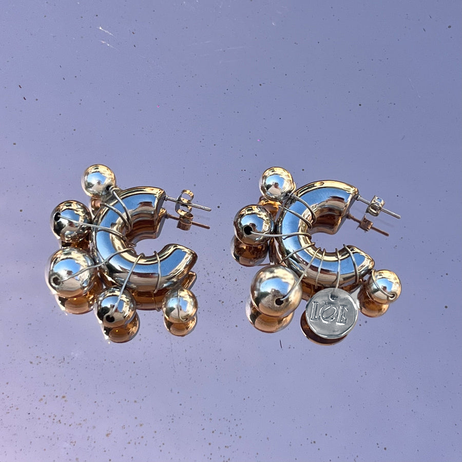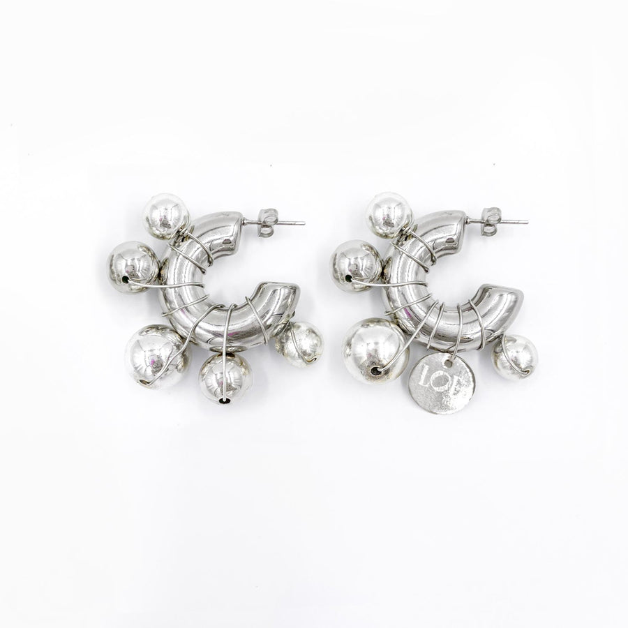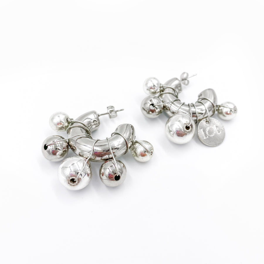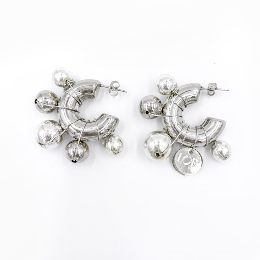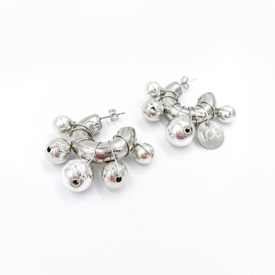 La paire de boucles d'oreilles NEVERMIND est composée de perles argentées de tailles différentes et d'une médaille LOE (poinçonnée à la main) enroulées sur deux anneaux de 3 cm argentés.