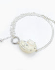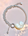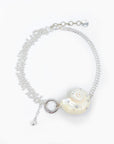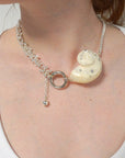 Ce collier argenté se distingue par son pendentif en nacre en forme de coquillage, orné de cabochons argentés. Suspendu entre deux chaînes fines et relié par un fermoir mousqueton, c'est un équilibre parfait entre audace et raffinement.