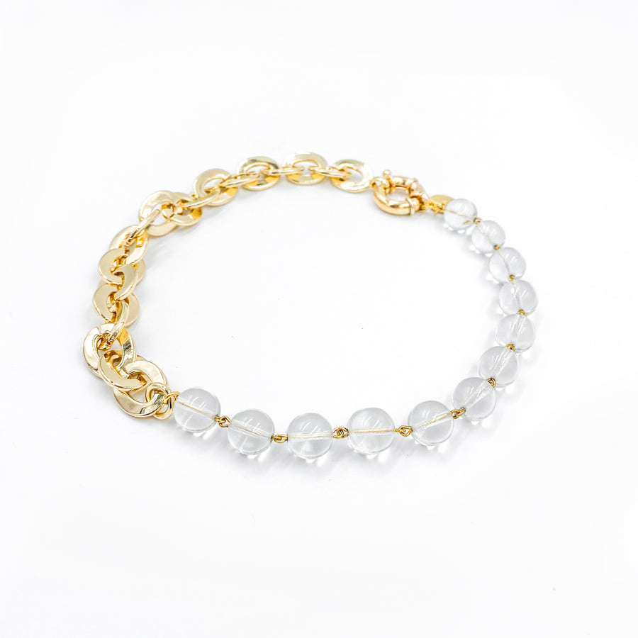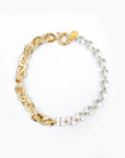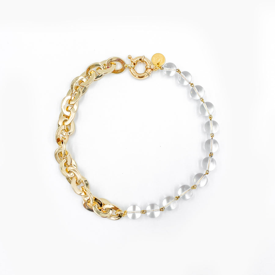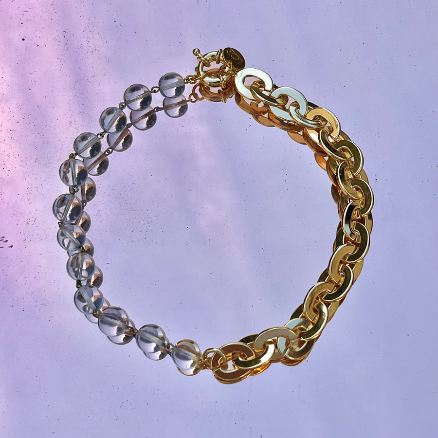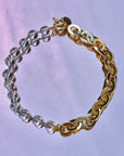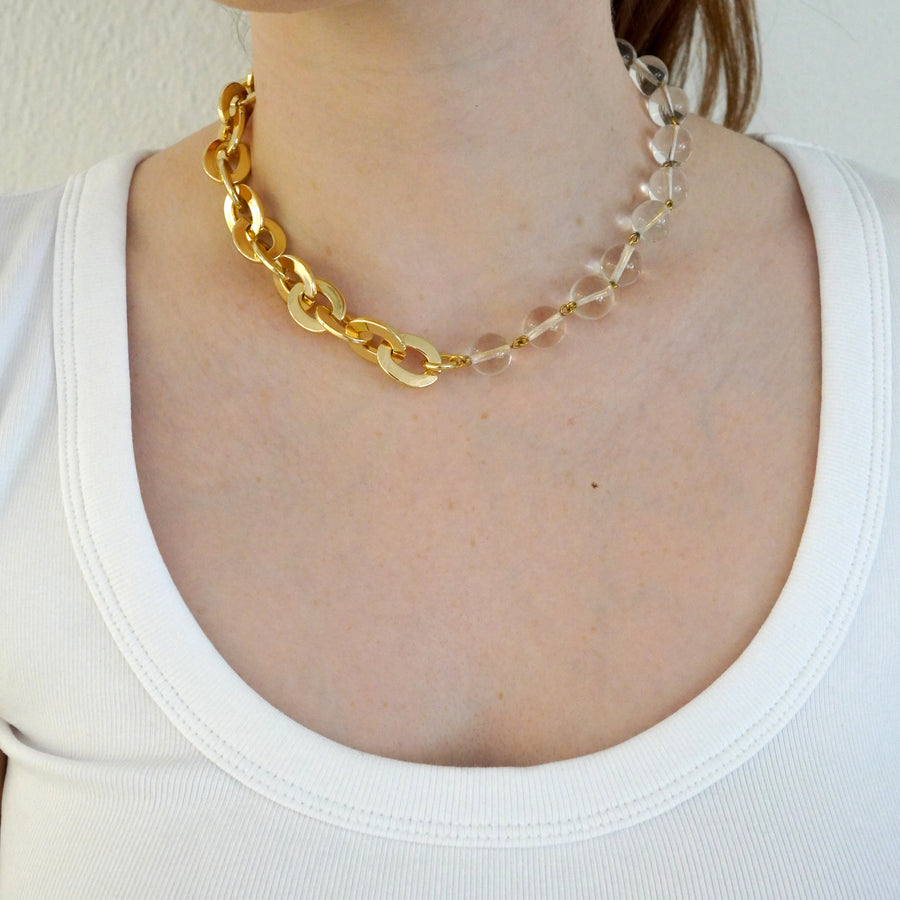 Le collier joue sur l’asymétrie en mêlant deux chaînes en laiton plaqué or, reliées au centre par des mousquetons dorés. Un strass blanc discret et un détail façon piercing ajoutent une touche lumineuse, tandis qu’une médaille cœur en argent plaqué or, finement gravée, tombe avec délicatesse.